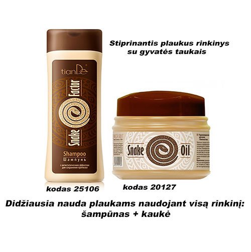 Kaukės „Snake Factor“ sudėtyje yra natūralūs gyvatės mamushi lipidai. Lipidai – kaip „cementas“, kuris saugo plaukus nuo pažeidimų, kuriuos sukeliame kaskart juos dažant, tiesinant, šukuojant (suardomas lipidinis sluoksnis). Dėl to plaukai netenka drėgmės, lūžta, veliasi, sausėja, šakojasi. Natūralūs gyvatės lipidai sugeba atstatyti ir pakeisti natūralų kiekvieno plauko apsauginį sluoksnį. Gyvatės taukuose, kaip ir kitų gyvūnų paodinėje ląstelienoje yra gausu vitaminų A, D, E ir B grupės vitaminų. Jie, kartu su nesočiosiomis riebiosiomis rūgštimis sudaro dvigubą veikimo tandemą: stimuliuoja kolageno ir elastino gamybą, saugo nuo UV spindulių bei laisvųjų radikalų, palaiko vandens, lipidų balansą, atstato drėgmę, bei natūralų kiekvieno plauko apsauginį sluoksnį. Plaukai lengvai šukuosis, bus ypatingai švelnūs.